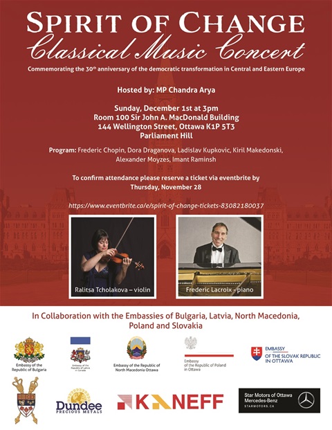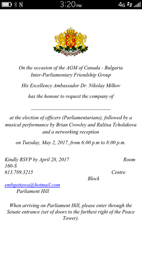 His Excellency Nikolay Milkkov, consular staff and leaders of the Bulgarian Canadian community witnessed the historic founding meeting of the Inter-Parliamentary Friendship Group. Ralitsa Tcholakova gave a brilliant violin performance to celebrate the historic evening. "