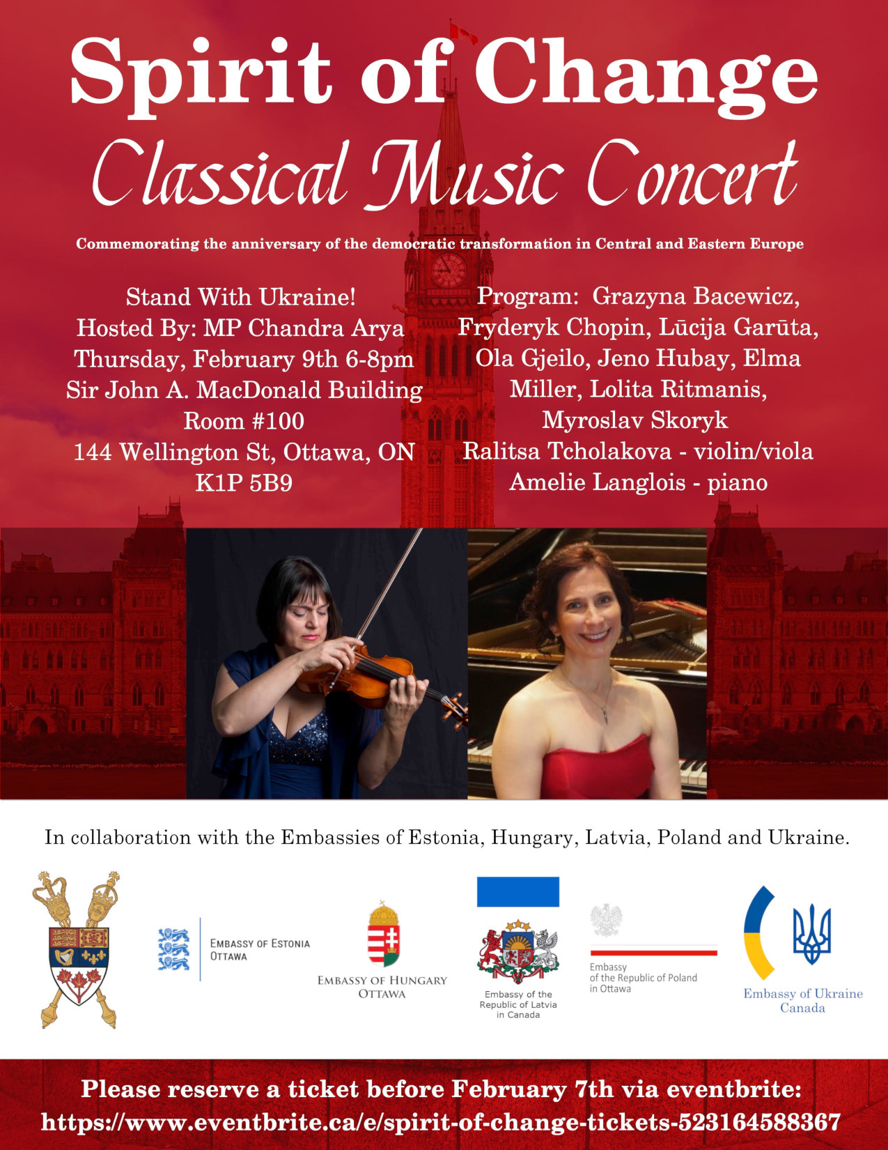The concert is organized in collaboration with the Delegation of the European Union to Canada and the Embassies of Bulgaria, Federal Republic of Germany, Latvia, the Republic of Poland, Romania and the Slovak Republic